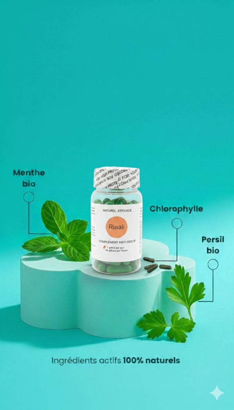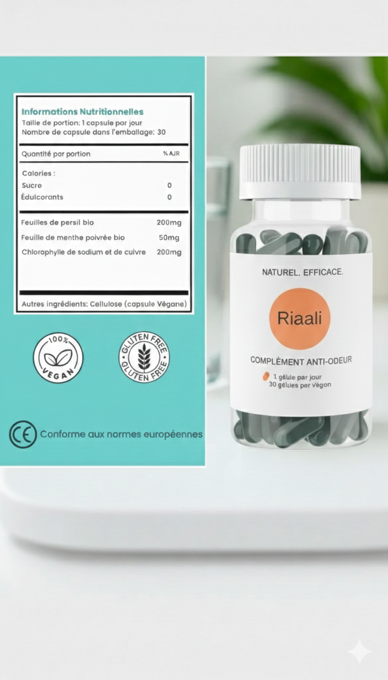 L’ingrédient puissant qui rend Riaali efficace. Cette forme concentrée de chlorophylle agit comme un désodorisant naturel, neutralisant les composés responsables des mauvaises odeurs dans votre circulation sanguine avant qu’ils n’atteignent votre peau.
